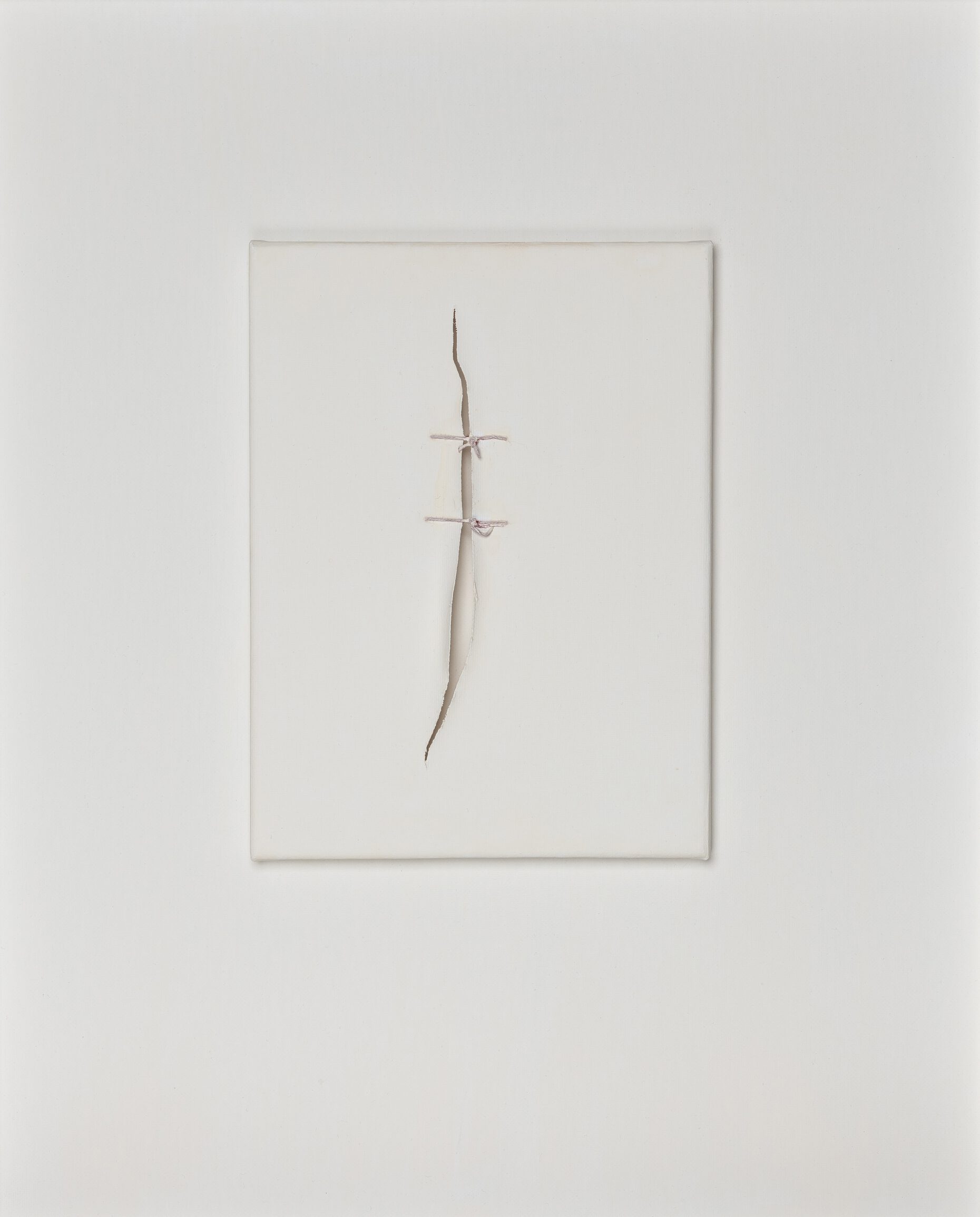 Fragile Traces VI (open wound) 24x2x18cm surgical stitches on casein on canvas 2025